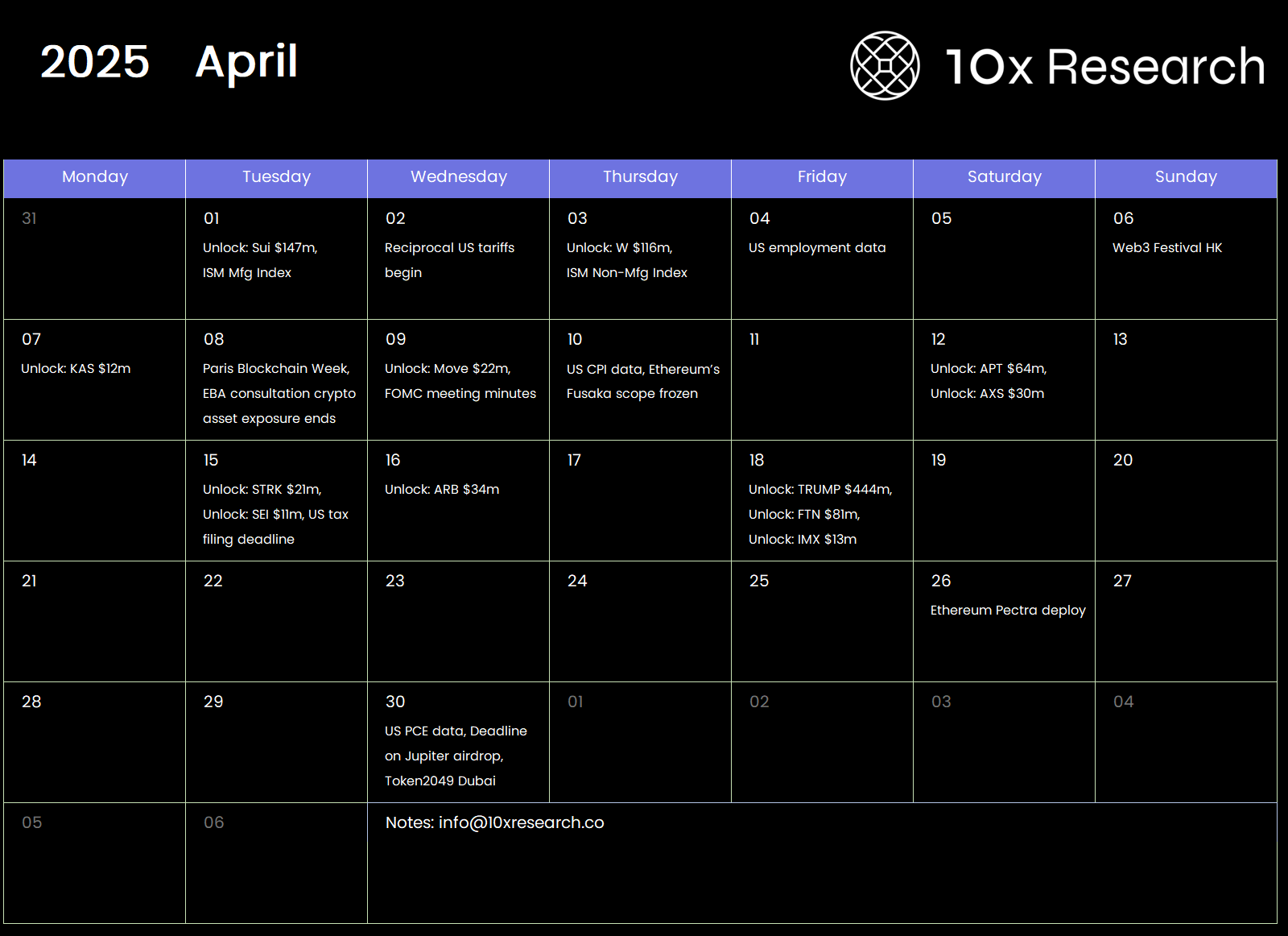 10x Research Calendar April 2025Institutional Crypto Research Written by Experts10x ResearchMar 27, 202521SharePlease find attached our April 2025 Crypto Calendar. We’ll share an updated version if any significant events are added.A downloadable pdf version can be found (here).10x Research Market Updates is a reader-supported publication. To receive new posts and support my work, consider becoming a free or paid subscriber.Subscribe