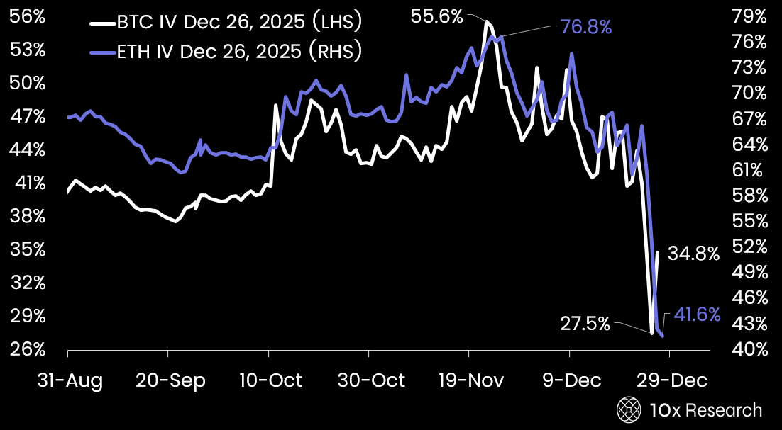 Bitcoin and Ethereum Implied Volatility collapsed into year end.