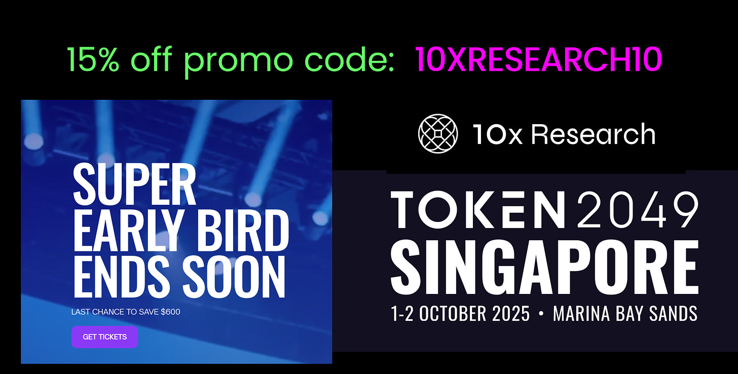 If you haven’t secured your Token2049 ticket yet, we’ve negotiated a 15% discount available through the link below. Tickets are expected to sell out quickly, and early-bird pricing is only available for a few more days, bringing the cost down to just $424 after discount. Don’t wait too long; if you haven’t already, be sure to register for our exclusive 10x Research side event.
