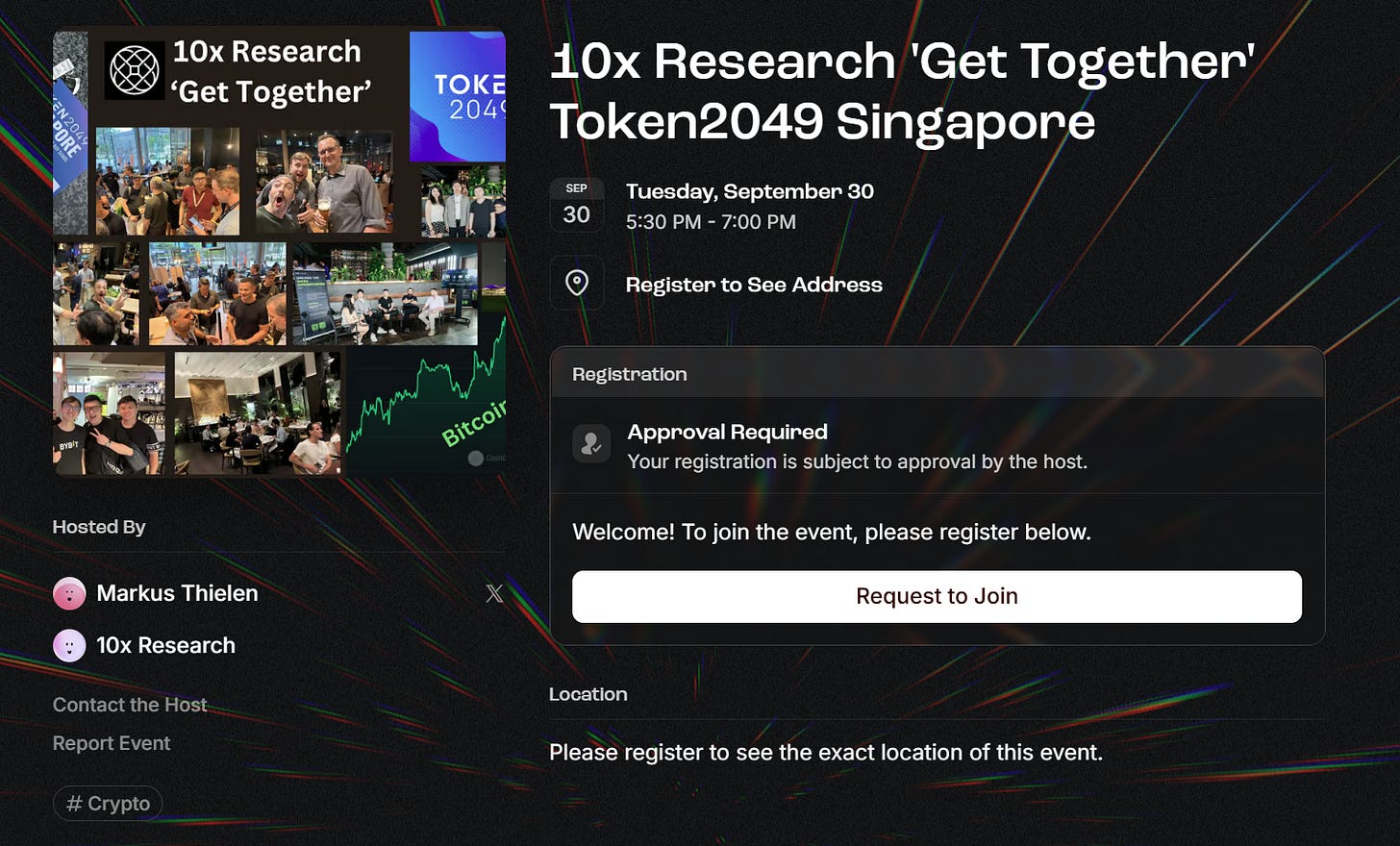 We’re hosting a private in-person event exclusively for premium 10x Research subscribers, taking place just one day before Token2049 kicks off. This is your chance to finally connect face-to-face with the sharpest traders in our community—names you already know from the 10x Telegram groups.