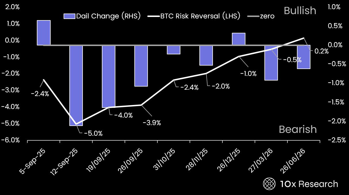The Bitcoin options market (sign up or see pricing here) is flashing clear warning signs: traders are pricing in event-driven downside risk, likely tied to the upcoming U.S. jobs data, BLS revisions, CPI, and the September 17 FOMC. Skew is deeply negative, with near-term expiries (Sep 6 and Sep 12) sitting at –4.3%, reflecting heavy demand for puts over calls. This tilt means traders are paying up for downside protection, fearing a sharp drop. But what does this mean historically? And what are trades?