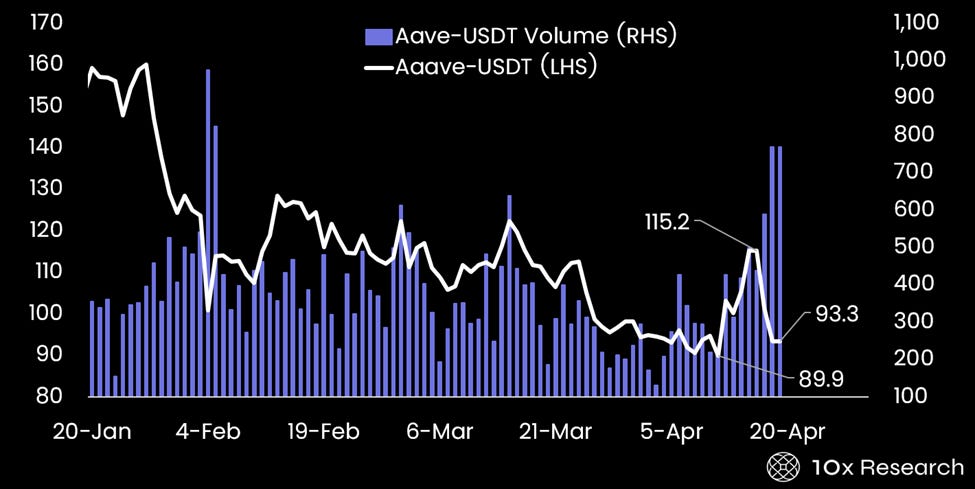 Aave-USDT (LHS) - Aave-USDT trading volume (RHS, $M)