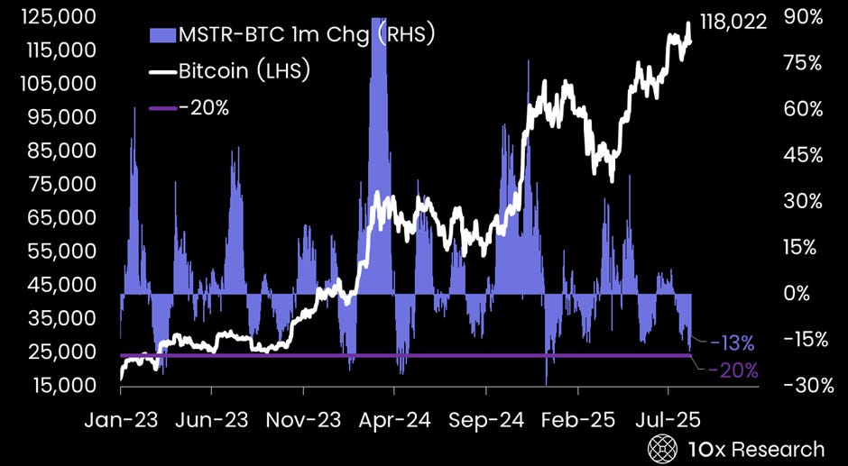 Historically, when MicroStrategy has lagged Bitcoin by 20% over one month, it has marked an attractive risk/reward entry point. However, the next decisive move will be critical—not only for MicroStrategy, but also for broader Bitcoin sentiment.