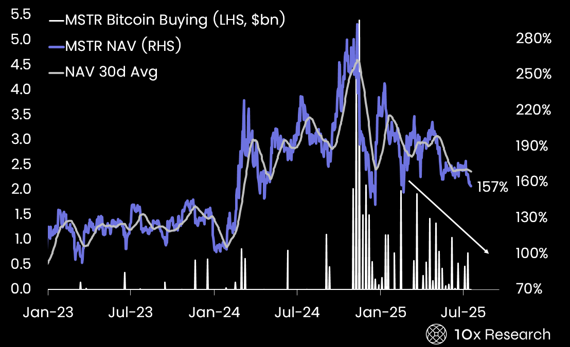 MicroStrategy’s 30-day capital raising (LHS, $bn) vs. MSTR NAV (RHS)