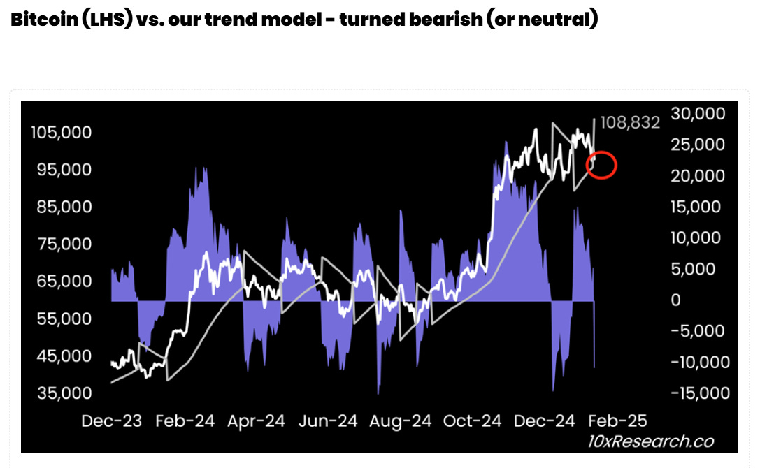 👇10-11) In our February 4 report, “Is Wall Street Losing Interest in Bitcoin?”, we warned of a sudden and persistent sell flow during U.S. market hours, suggesting it could be driven by Bitcoin ETF liquidations—which have now surpassed $3 billion in February. We highlighted that our Bitcoin trend model had turned bearish at $96,000, anticipating a retest of the $90,000–$91,000 support zone.