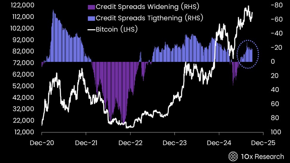 Bitcoin (LHS) vs. Credit Spreads (RHS, inverse)