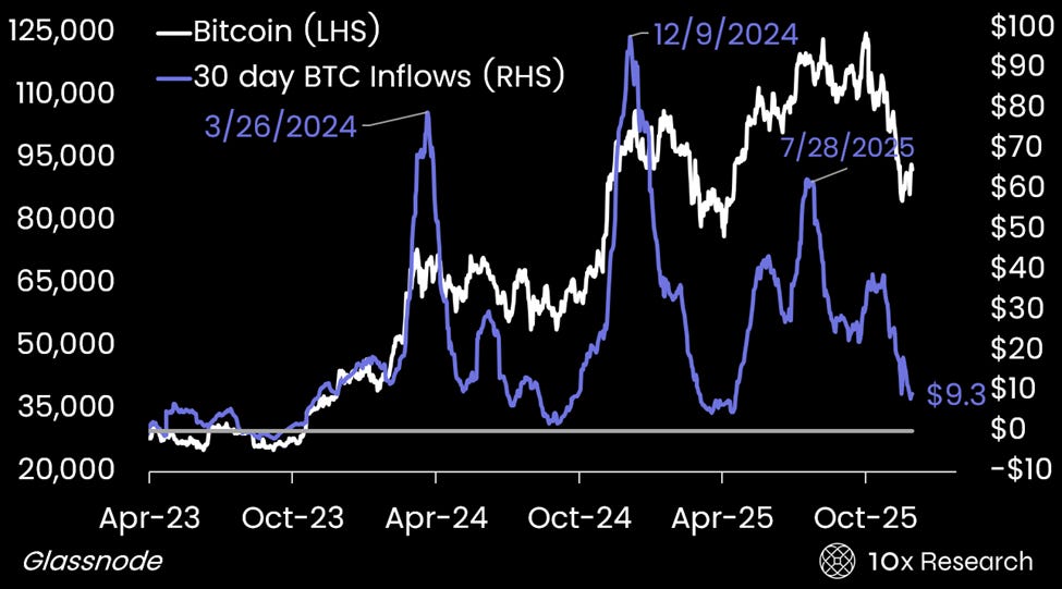 Only when this indicator bottoms and turns higher will the next durable bull phase begin, but until then, rallies remain tactical, not transformational. Below, we outline why this indicator matters and the conditions required for BTC inflows to restart. This framework already allowed us to anticipate the October (bear market) breakdown (here), and it will do the same in identifying when the next sustainable rebound, not a tactical bounce, can truly begin.