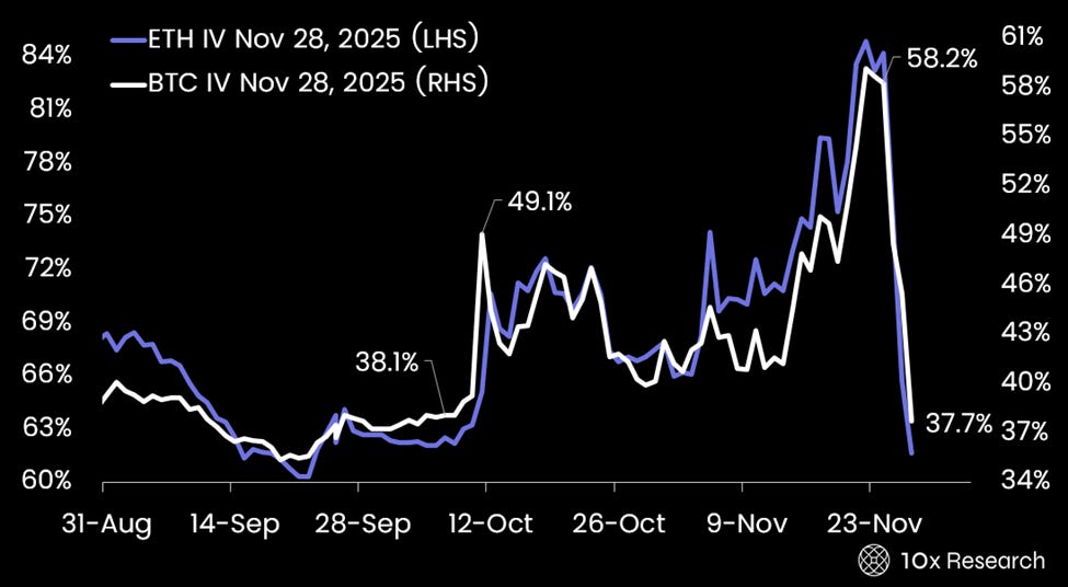 Bitcoin’s implied volatility for the November 28 expiry has now fallen below the levels seen when it made new all-time highs in early October. After trading around 58% on Monday, implied volatility has since collapsed by roughly 20 points, with December expiries also down about 8 points.