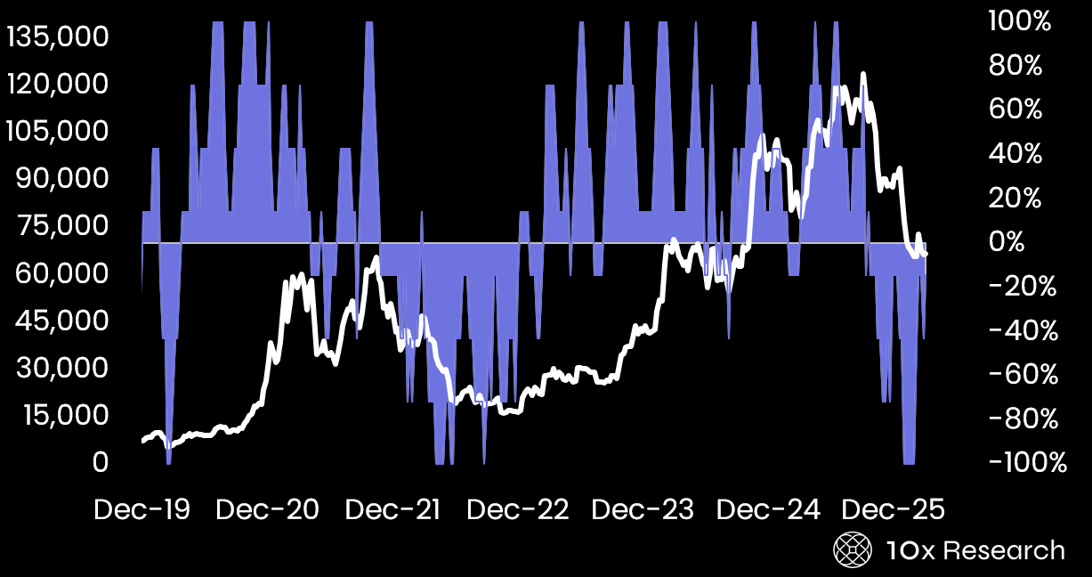 After five consecutive months of declines, matched only once during the 2018–2019 bear market, Bitcoin has finally posted a marginally positive month, gaining around 2%. Initially, we were cautiously constructive in March. While Bitcoin tends to perform better in April, those returns are skewed, but there is a notable relationship between how Bitcoin performs in April and the technical conditions it enters the month with.