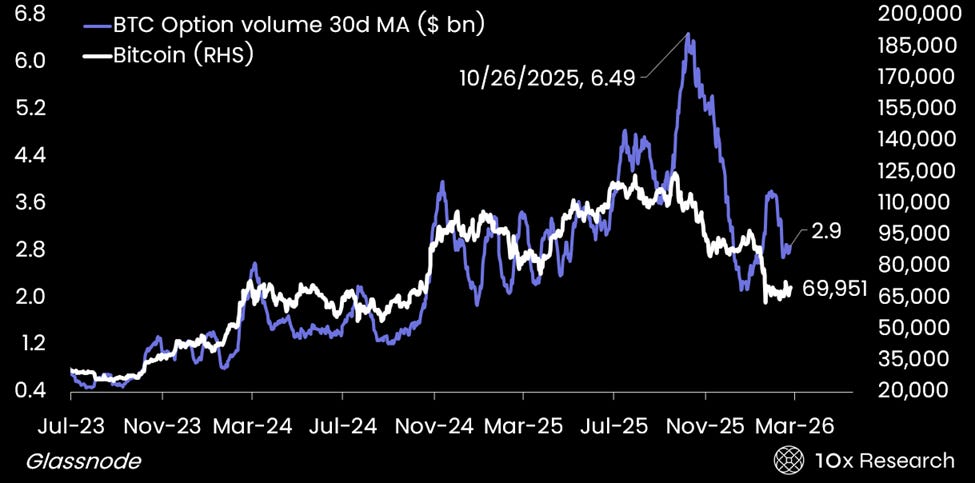 BTC Option Volume (LHS, $ bn, 30-day MA) vs. Bitcoin (RHS)