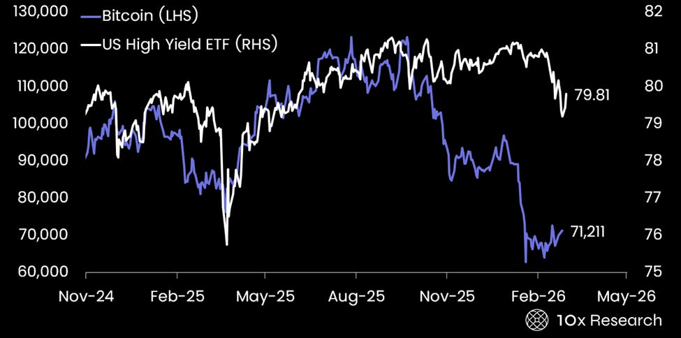 Bitcoin (LHS) vs. US High Yield ETF HYG (RHS)
