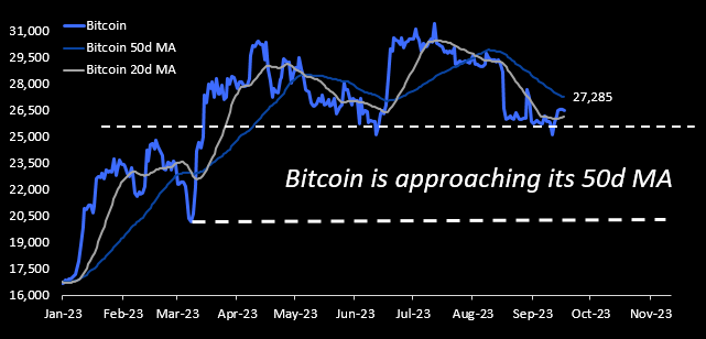 ๐ 7) Tactically, our Bitcoin MP Greed & Fear index has bottomed, making us more constructive with anticipation of higher prices. In addition, Bitcoin is approaching the 50-day moving average ($27,285), a medium-term bullish signal.