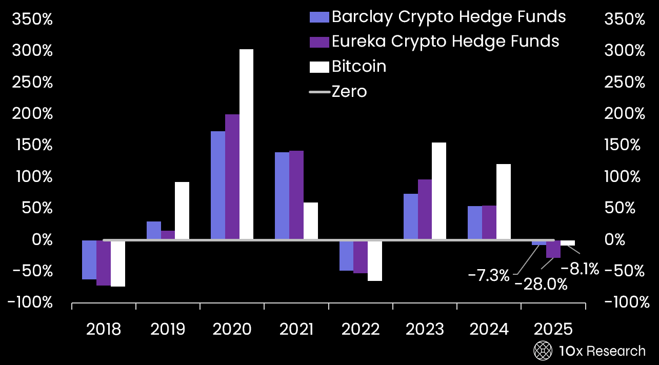 Importantly, from the start of the year, we also advised traders to hedge Bitcoin long exposure with a basket of altcoin shorts (here), reflecting our particularly bearish view on the broader altcoin complex. This approach would have delivered meaningful long/short, relative-performance alpha, precisely the type of outcome many crypto hedge fund managers are now seeking as they confront an increasingly challenging environment in 2025 and in 2026. If they are still in business.