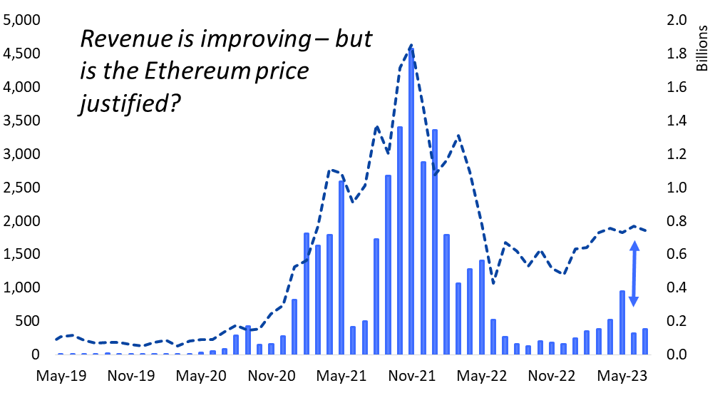 Chart: Ether price (LHS) vs. Monthly Revenue (RHS, billions)