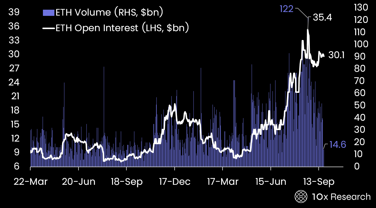 Ethereum Open Interest (LHS) vs. ETH Volumes (RHS)