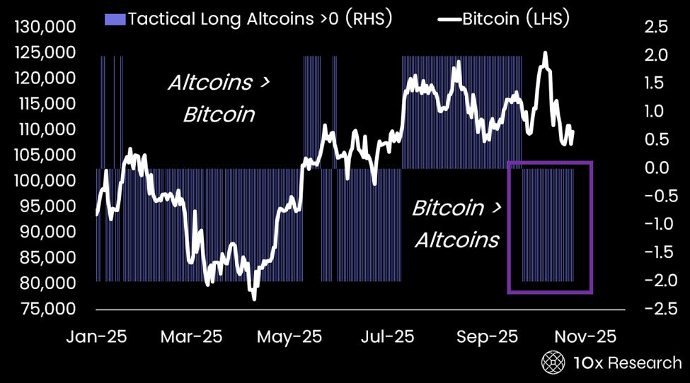 Over the past 30 days, our tactical altcoin model has favored Bitcoin over altcoins, reflecting a bottoming out in Bitcoin dominance. This shift follows a 75-day period in which the model preferred altcoins, a phase that coincided with Ethereum’s rally, but that trend has clearly ended. The model’s pivot back toward Bitcoin came at a critical moment, two weeks before altcoins suffered a sharp sell-off on October 11, 2025.