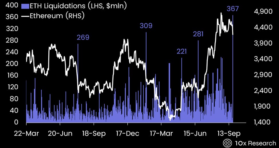 The crypto market, led by Ethereum, just experienced one of its largest liquidation events, the biggest since September 2021. Historically, such spikes often mark local lows and increase the probability of a rebound, a view reinforced by negative funding rates, which show that faster traders are now net short. However, before rushing to “buy the dip,” traders should weigh key considerations around positioning, technical signals, and how the market is priced heading into October.