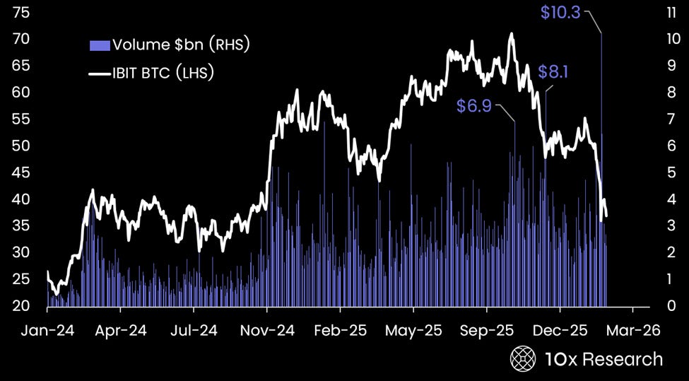 During Bitcoin corrections, trading activity in BlackRock’s IBIT Bitcoin ETF tends to surge, with volumes expanding significantly as institutional positioning adjusts. During the most recent selloff, daily trading volume exceeded $10 billion, underscoring the scale of institutional capital’s active repositioning.