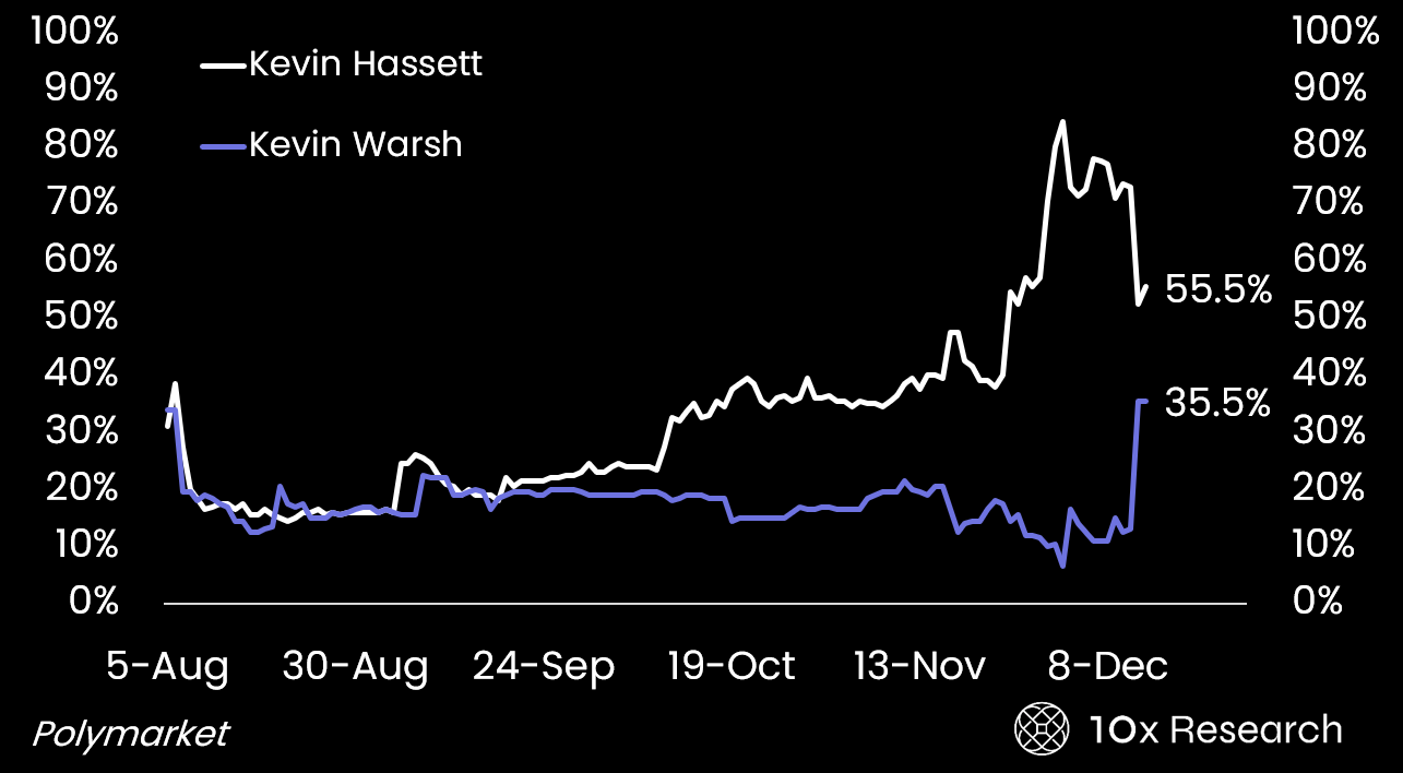 Based on prediction markets, the odds of Hassett securing the nomination have fallen sharply, dropping from 75% to 56%, while Warsh’s chances have risen significantly, climbing from 13% to 36%. Below, we examine Warsh’s economic track record, his stance on easy monetary policy, and how his framework shapes his views on Bitcoin.