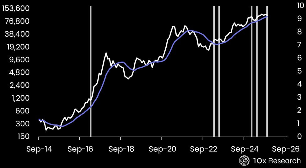 Bitcoin (log chart, LHS) vs. its 1-year moving average vs. outside month (RHS)