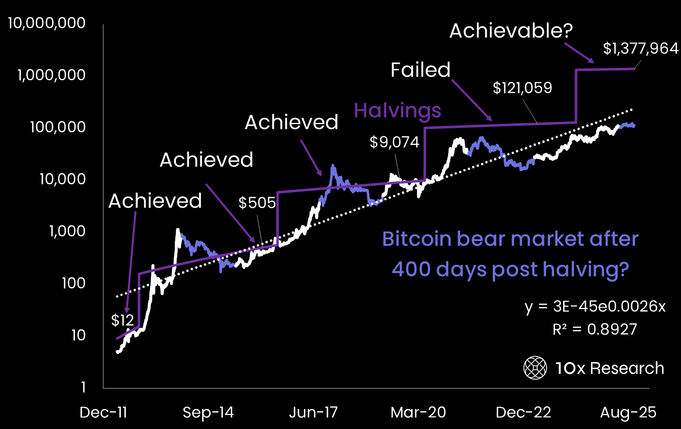Bitcoin closely followed the stock-to-flow model’s projections until the 2021 bull market, when the model predicted a surge above $100,000—a target widely echoed by leading commentators at the time. This same logic now fuels talk of $1 million price targets for the current cycle, as the model would imply. Using a different methodology, we once projected this cycle could push Bitcoin toward $125,000 (see July 2023) —but our understanding of Bitcoin’s cycle dynamics has evolved significantly since then.