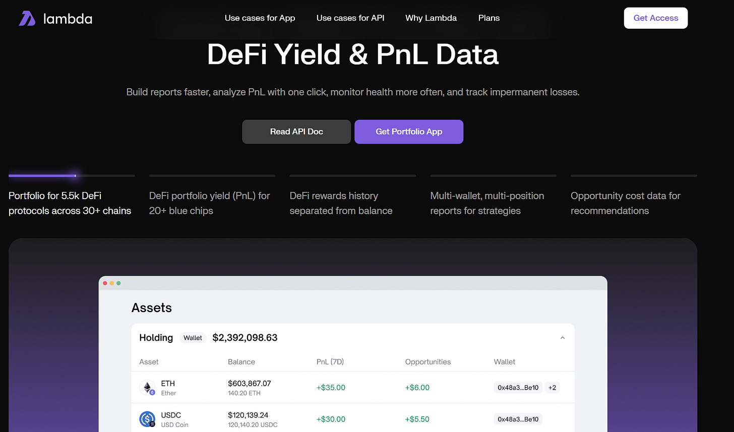 Lambda is a portfolio management platform for DeFi. Already used by asset managers with $1.5B AUM, it automates reporting for complex strategies. With Lambda, you can track PnL across protocols, see impermanent loss, view rewards history separately from balance history, and exclude the asset price growth factor. Perfect for lend-borrow strategies and multi-asset DeFi positions.