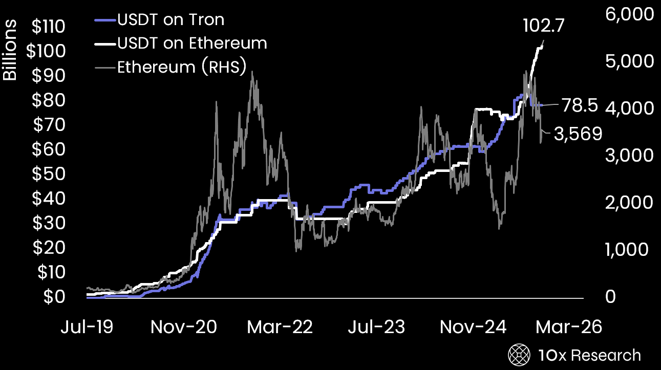 Stablecoin issuance (LHS, $ billions) vs. Ethereum (RHS)