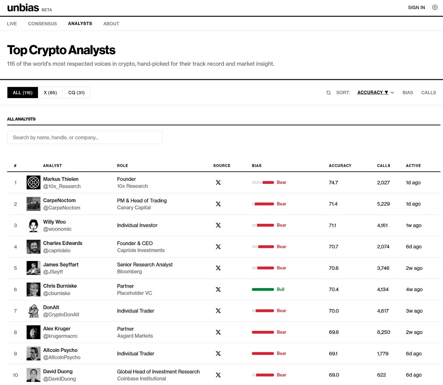 The team at CryptoQuant has recently released a beta version of its analyst rankings, covering 116 of the world’s most respected crypto voices, selected for their track records and market insights. While our 10x Research research is distributed primarily behind a paywall (here) and reserved for subscribers, CryptoQuant appears to have inferred our directional views from our published commentary and market calls, ranking 10x Research as the No. 1 analyst in its initial release.