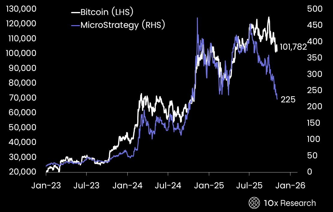 Bitcoin (LHS) vs. MicroStrategy (RHS)