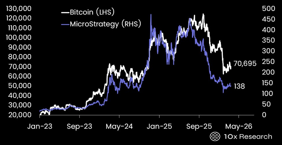 Bitcoin (LHS) vs. MicroStrategy (RHS)