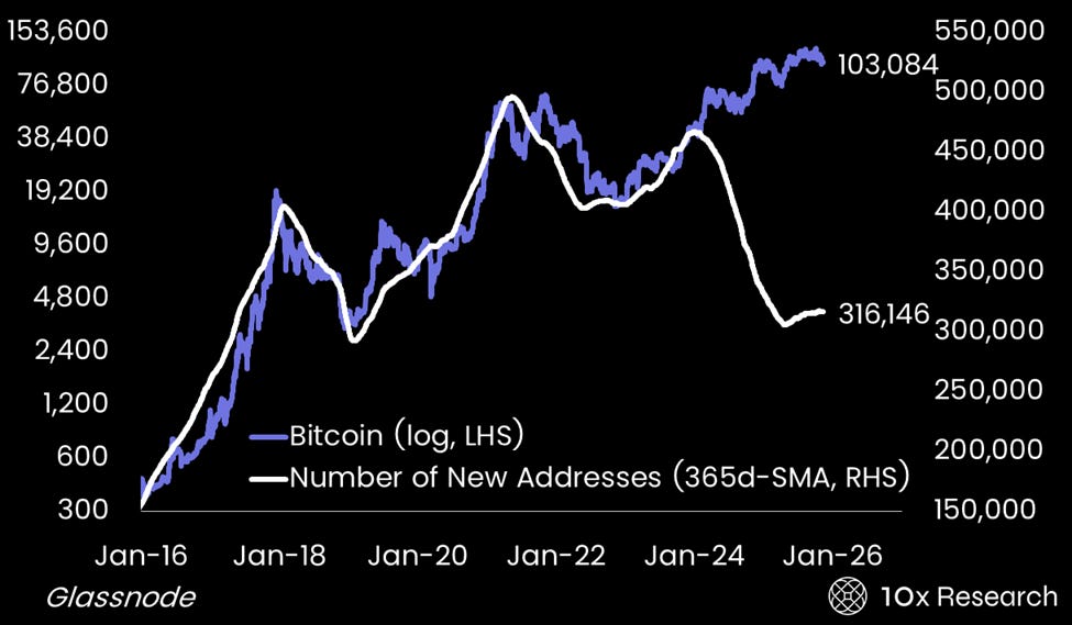 Without a clear and durable macro catalyst, Bitcoin and the broader crypto market are likely to remain range-bound, even as long-term structural tailwinds continue to strengthen. The central question is unchanged: who is the marginal buyer at this stage of the cycle, and what will pull them back in? New BTC address growth remains tepid, underscoring that a shrinking cohort of high-conviction participants is driving price action. While these buyers have meaningful purchasing power, one key event is still holding them on the sidelines, and until that unlocks, momentum will struggle to re-accelerate.
