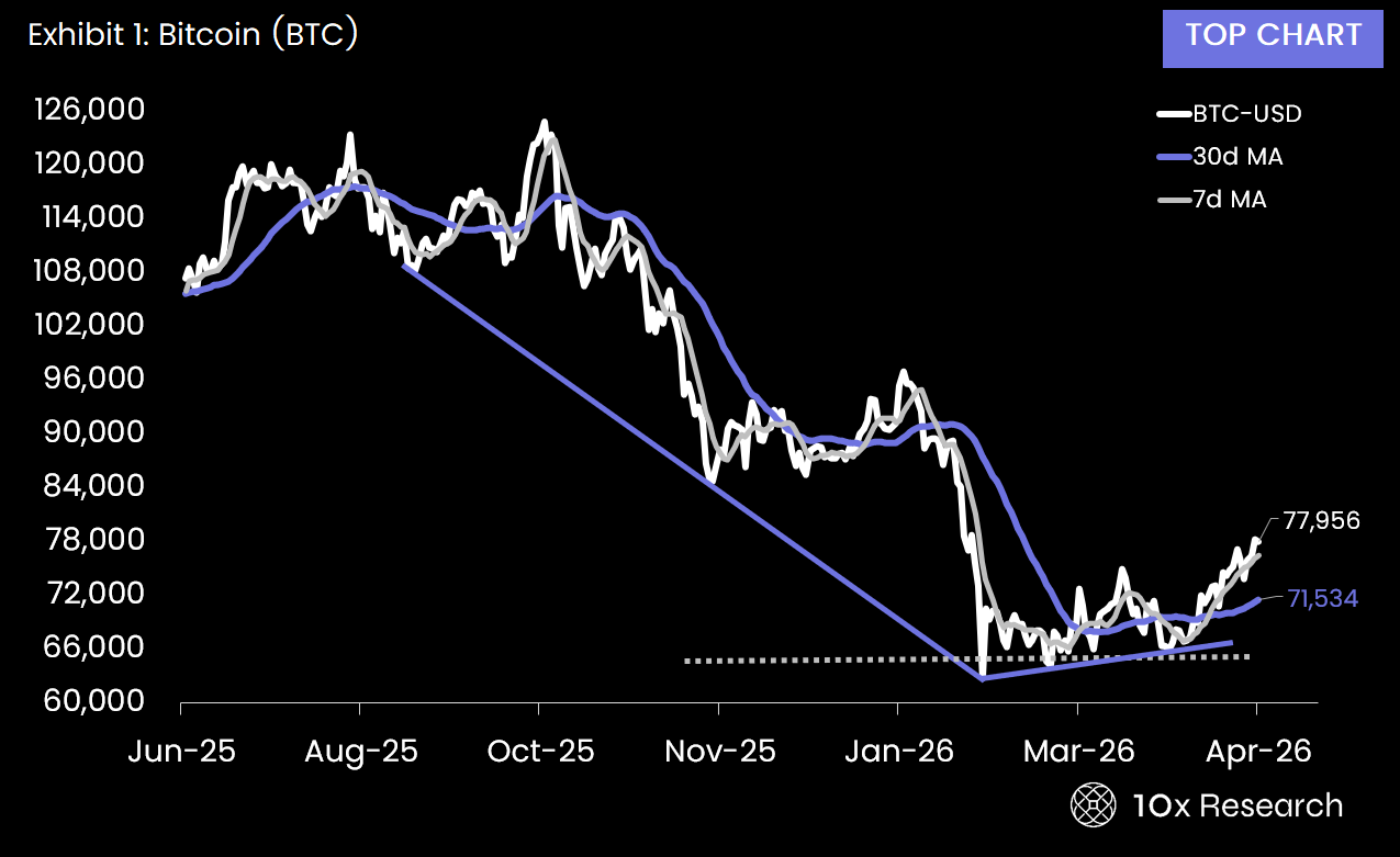 Bitcoin — BTC remains in a bullish technical setup with a +5.3% weekly gain, supported by Strategy’s $2.54B purchase, exchange balances at multi-year lows, and nearly $1B in weekly ETF inflows, while the KelpDAO hack had minimal impact on price.