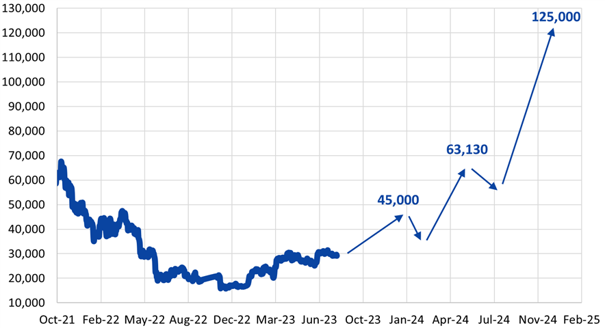 Exhibit 1: Projected Bitcoin path: Year-end 2023, April 2024 halving, Year-end 2024