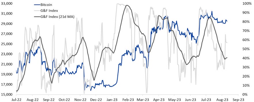 👇 1) After four weeks of signalling downside pressure, our Greed & Fear index (exhibit 2) has just turned bullish. Bitcoin prices have been pinned at $29,000 for three weeks, refusing to decline, despite the correction in some large-cap technology stocks (Apple, Nvidia, and Microsoft). The 10-year US bond yield has also climbed above 4.0%, which should have been a warning signal for risk asset investors.