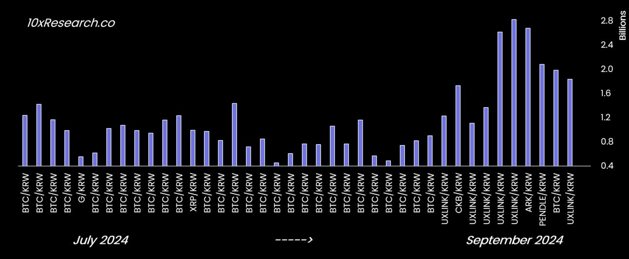 👇3-12) Trading volumes for altcoins have surged, and there's been a significant shift away from Bitcoin—previously the top choice among Korean traders in August—toward high-beta alternatives. In the following sections of this report, we spotlight some of the altcoins that savvy traders are currently accumulating.