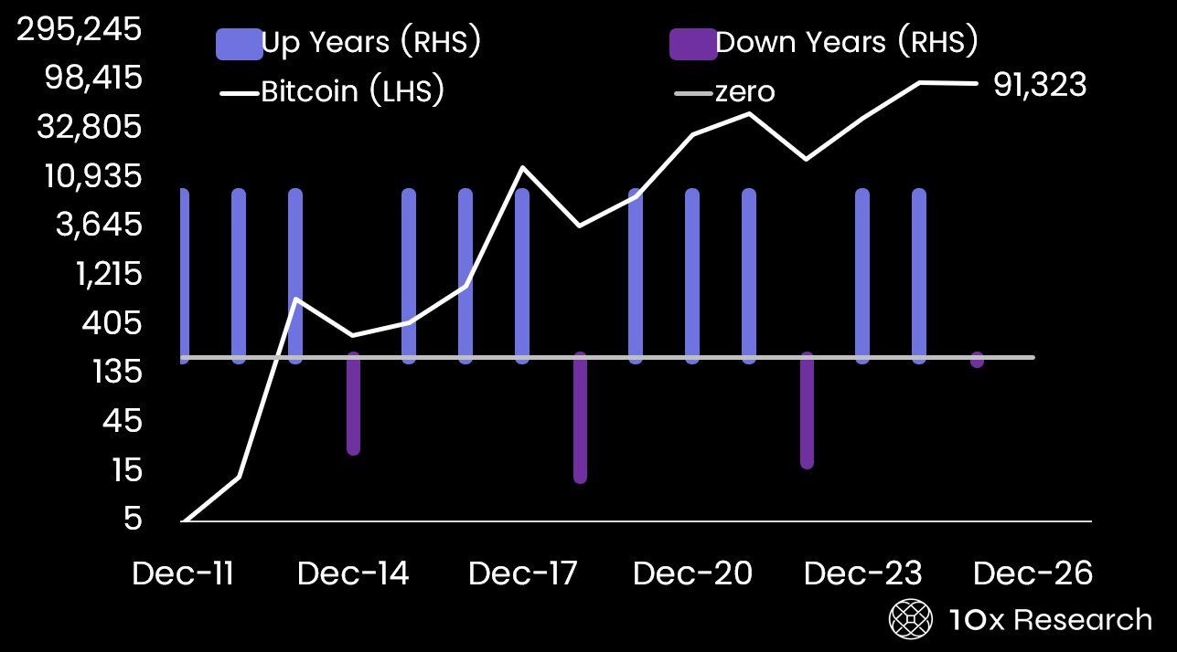 Bitcoin (LHS, log) vs. positive and negative years (RHS)
