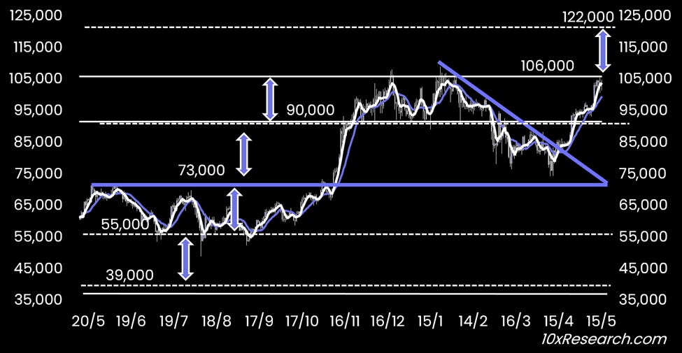 Bitcoin is approaching the critical $106,000 resistance level, with $122,000 as the next target.