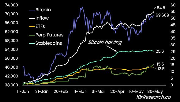 Bitcoin and various flows (Stablecoins, ETFs, Futures leverage)