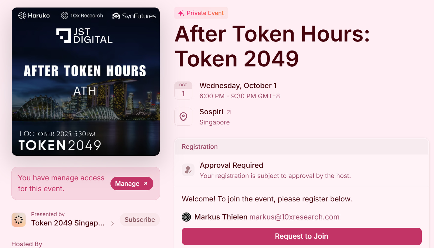 Please note: our Token2049 side event has been rescheduled from Tuesday at 5:00 p.m. to Wednesday, October 1, from 6:00 p.m. to 9:30 p.m. If you haven’t registered yet, you can sign up here. We encourage you to arrive early—this is an outstanding venue and a fantastic opportunity to connect with fellow 10x Research subscribers.