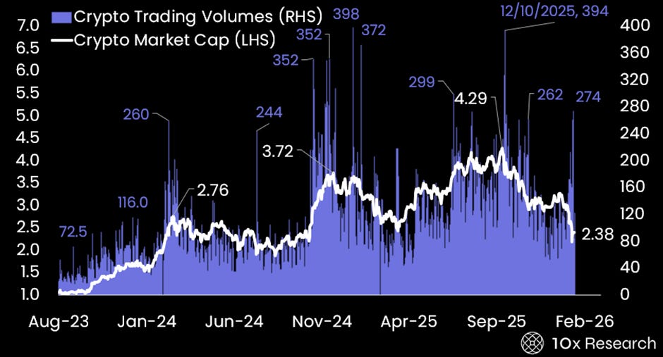 Crypto Market Cap (LHS, $ trillion) vs. Crypto Trading Volume (RHS, $ billion)