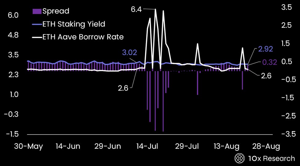 Spread (RHS) between ETH Staking Yield - Borrow rate (LHS)
