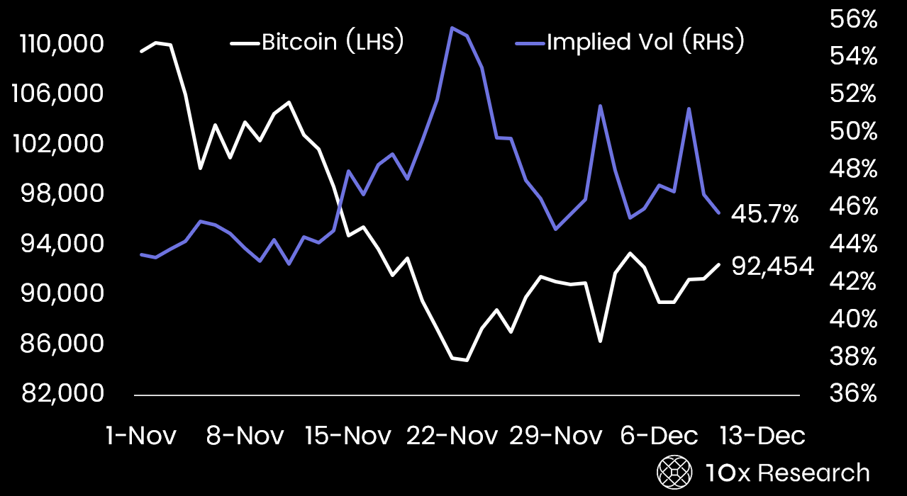 Bitcoin (LHS) vs. Implied BTC Volatility (RHS)