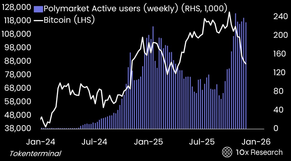 Bitcoin (LHS) vs. Polymarket active weekly users (RHS, x1,000)