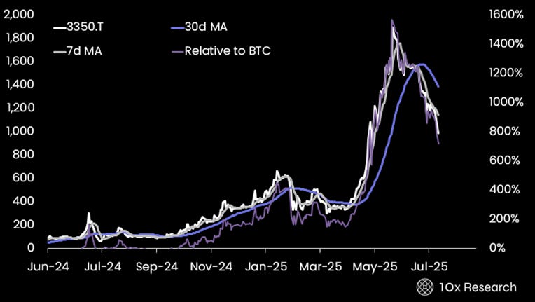 Crypto stocks are unwinding sharply, and some of the most hyped names are now down 30–50% from their highs. Momentum has faded, valuations remain stretched, and volatility is collapsing, leaving many investors stuck with losses and even fewer willing to step back in. From Coinbase to Circle, signals we flagged in late June (here) are now playing out with striking precision. But this isn’t just about short-term corrections—it’s about the deeper repricing of crypto’s equity narrative. Some names may still have room to fall, while others could be nearing high-conviction entry points.