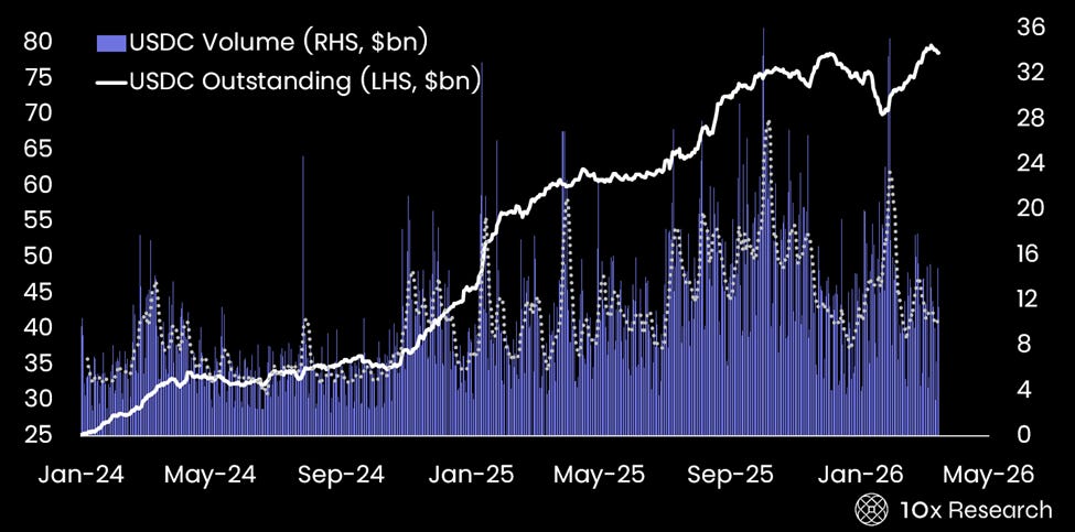 USDC Outstanding (LHS, $bn) vs. USDC Volume (RHS, $ bn)